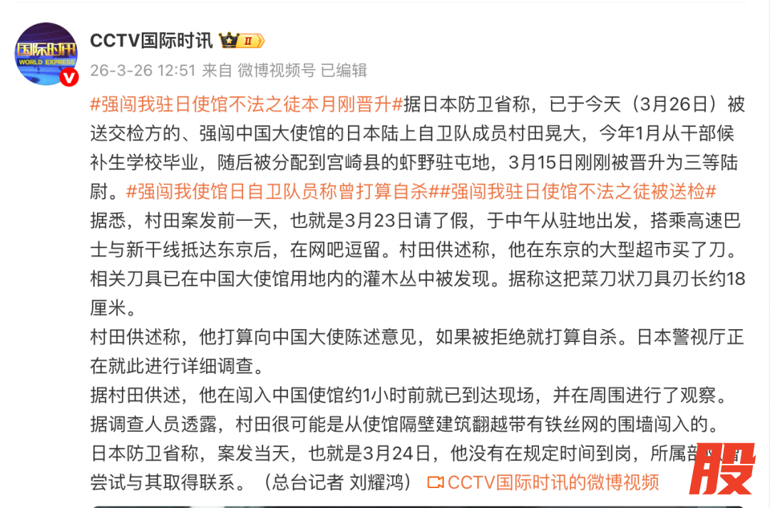 据日本防卫省称,已于今天(3月26日)被送交检方的、强闯中国大使馆的日本陆上自卫队成员村田晃大,今年1月从干部候补生学校毕业,随后被分配到宫崎县的虾野驻屯地,3月15日刚刚被晋升为三等陆尉。