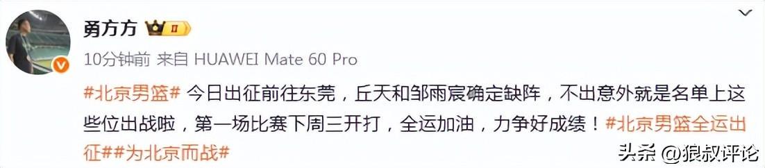北京时间11月1日,根据媒体人“勇方方”的报道,北京男篮今日出征前往东莞东方汇赢,丘天和邹雨宸确定缺阵,不出意外就是名单上这些位出战啦,第一场比赛下周三开打,全运加油,力争好成绩!